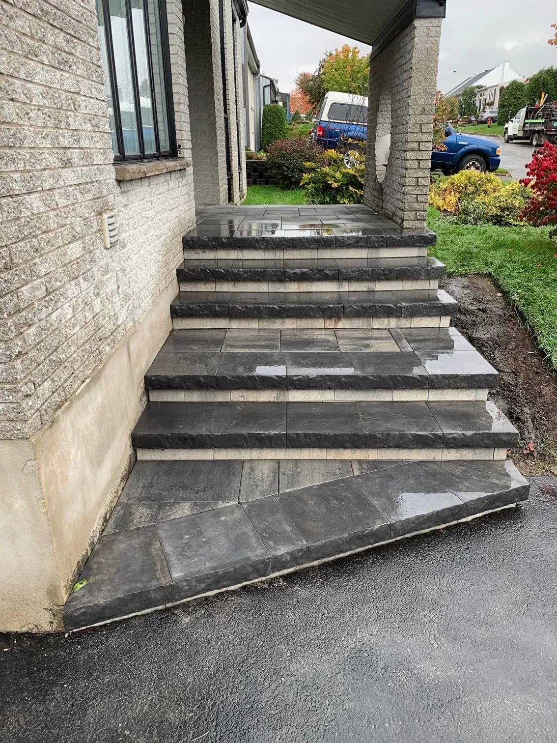 Nous avons refait, l’entrée en asphaltage, excavation, muret roches, perron en interbloc ainsi qu’un trottoir de pierres naturelles. J’ai eu un très bon service de la part d’Émilie et Jean-Benoit.